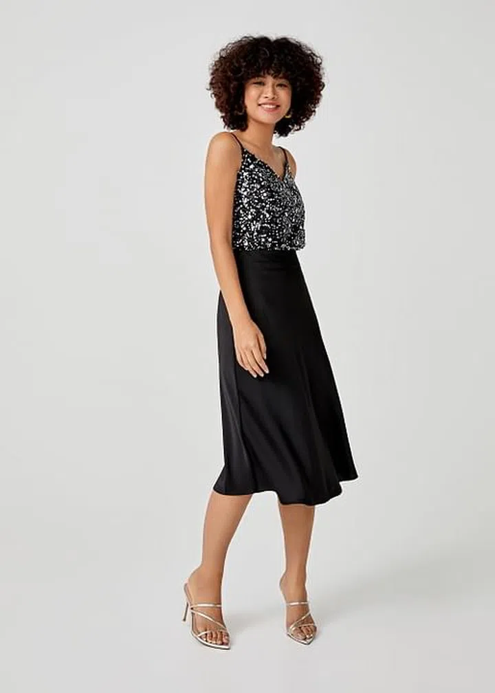 This satin slip skirt is a must-have in any woman’s wardrobe. Pair with white sneakers and graphic tee for a sporty chic look, or strappy sandals for after-work drinks with the girls.