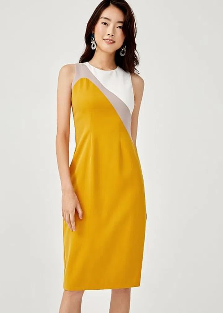 Mustard can be a daunting colour to pair at first, but the key is identifying whether the mustard you have on hand leans towards gold or chartreuse. This colourblock number borders on gold, and would thus look amazing against electric blue accessories.