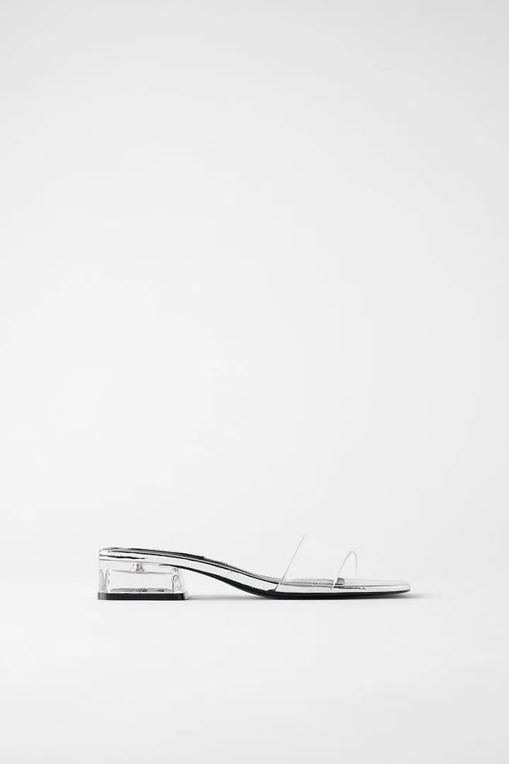 Get: Silver mid-heel sandals with vinyl strap, $59.90 from Zara