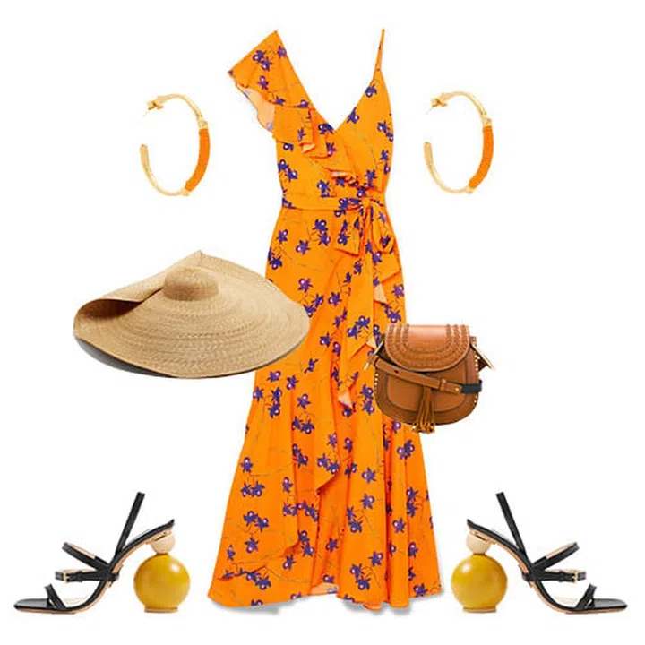 Marte Frisnes earrings, $135; Jacquemus straw hat, $379; Jacquemus heels, USD589.85, Borgo De Nor dress, $743.53; Chloe bag, $3,225