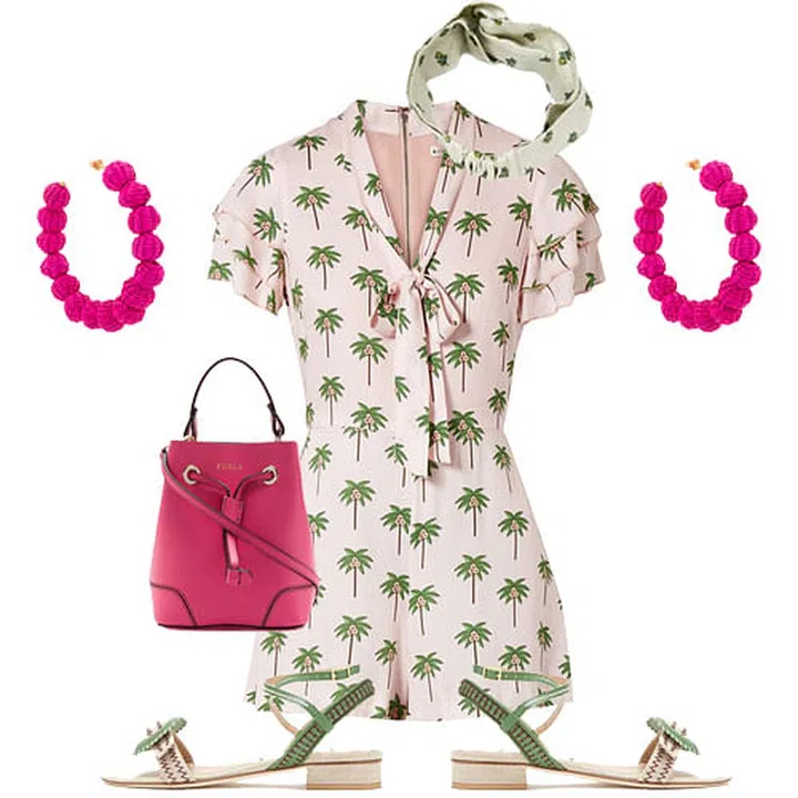 Carolina Herrera earrings, $293; Furla bag, $339; Rue St. sandals, $396; Alice + Olivia playsuit, USD340.42; Valentino headband, $460