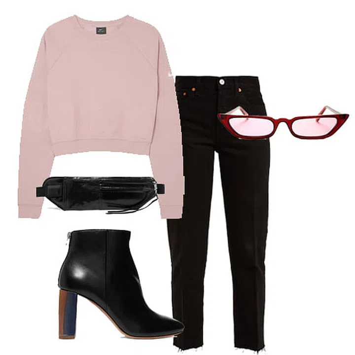 Nike crop sweater, USD71.19; Rick Owens belt bag, USD463; Acne Studios boots, USD625.23; Re/done Originals jeans, $211; Haight sunglasses, $289