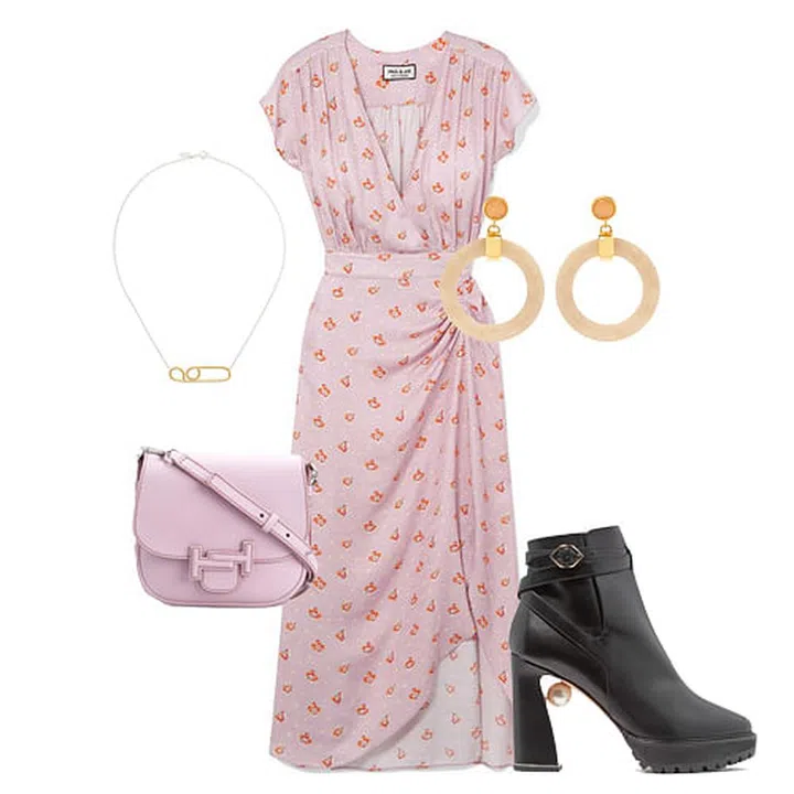 Wouters & Hendrix necklace, $300; Tod’s bag, $2,161; Paul & Joe dress, USD633.35; Lizzie Fortunato earrings, $200; Nicholas Kirkwood boots, USD1,064.81