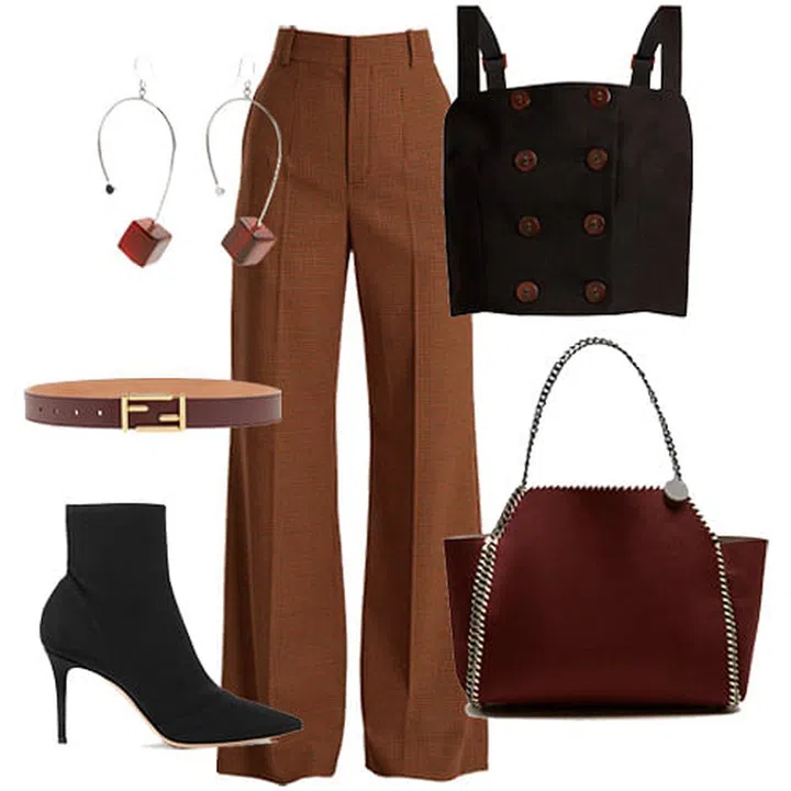 Marni cube earrings, $235; Fendi logo belt, $1,132; Gianvito Rossi boots, USD1,007; Chloe trousers, $411; Albus Lumen top, $196; Stella McCartney tote, $878