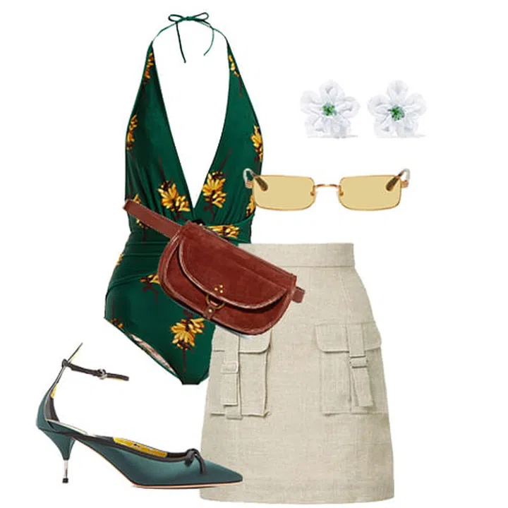 Adriana Degreas swimsuit, $261; Jerome Dreyfuss belt bag, USD465.97; Rochas shoes, $694; Bambah skirt, $677; Dries Van Noten sunglasses, USD370; Isabel Marant earrings, USD395