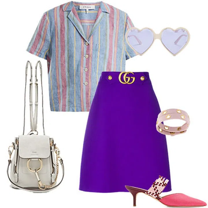 Chloe Faye bag, $1,422; Frame blouse, $210; Gucci A-line skirt, $1,237; Gucci sunglasses, $401; Salvatore Ferragamo bracelet, $212; Malone Souliers shoes, $554