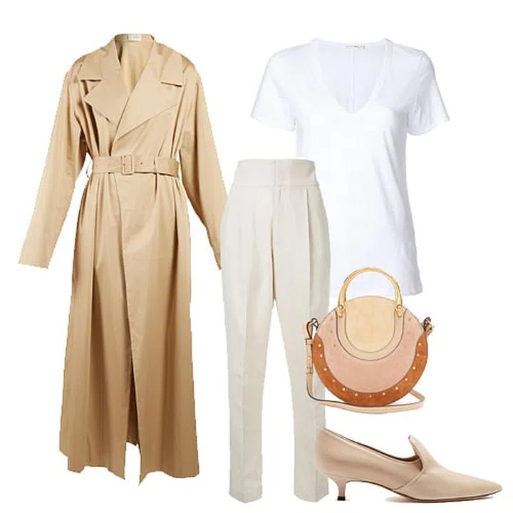 The Row trench coat, $2,000; Bambah cigarette pants, $414; Rag&Bone t-shirt, $125; Chloe Pixie, $1,722; The Row shoes, $948