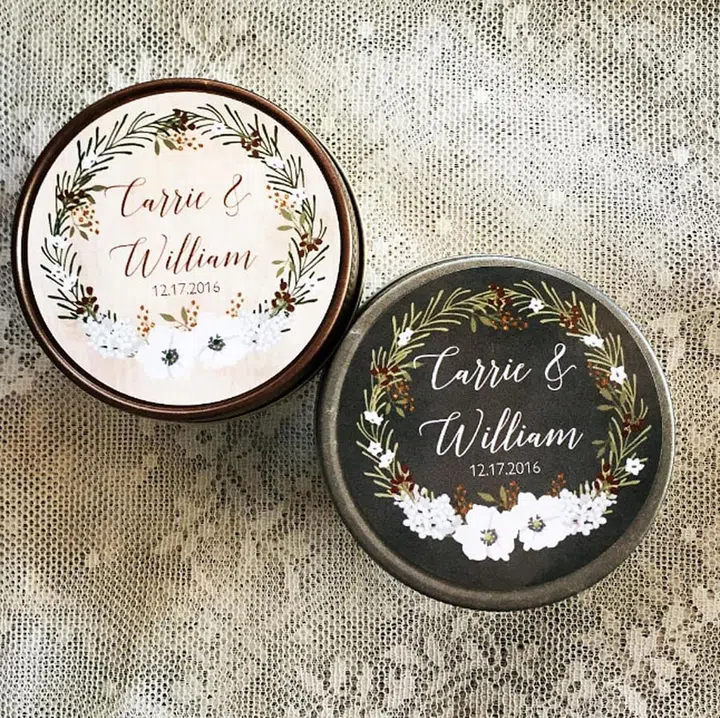 Printed stickers pretty up these candle wedding favours - they can be used on any other favour packaging too.