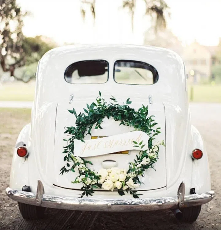 A vintage Volkswagen Beetle is a timeless and super cute way to arrive at your wedding. Make the moment all the more picture-perfect with your ride dressed up with a pretty wreath.