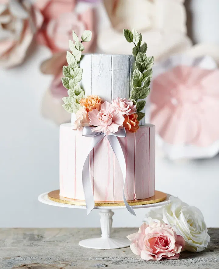Alternatively, have it on your cake instead. Let the foliage do the talking with a leafy sugar wreath, complete with pretty pastel blooms. The fondant is design to resemble cracked bark, lending to the outdoorsy vibe.