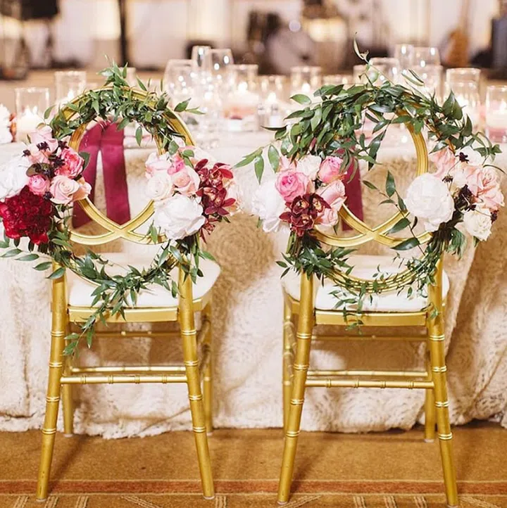 Aside from drapes, consider lush greens and beautiful peonies and roses to give your chairs a garden-esque feel.