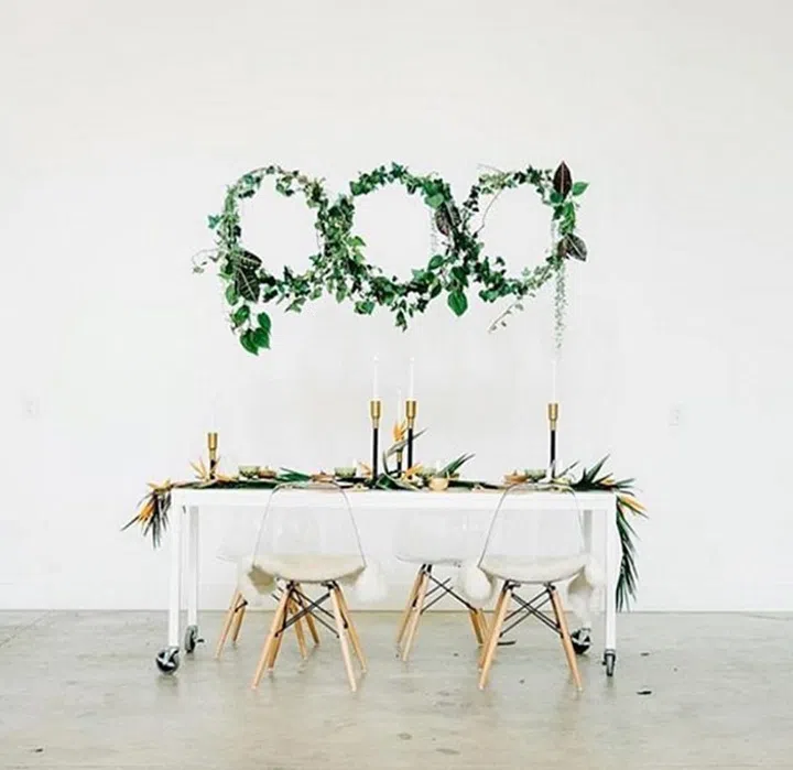 Flowers can be pricey. Save cost with this equally pretty and refreshing alternative instead - green wreaths suspended above the table.