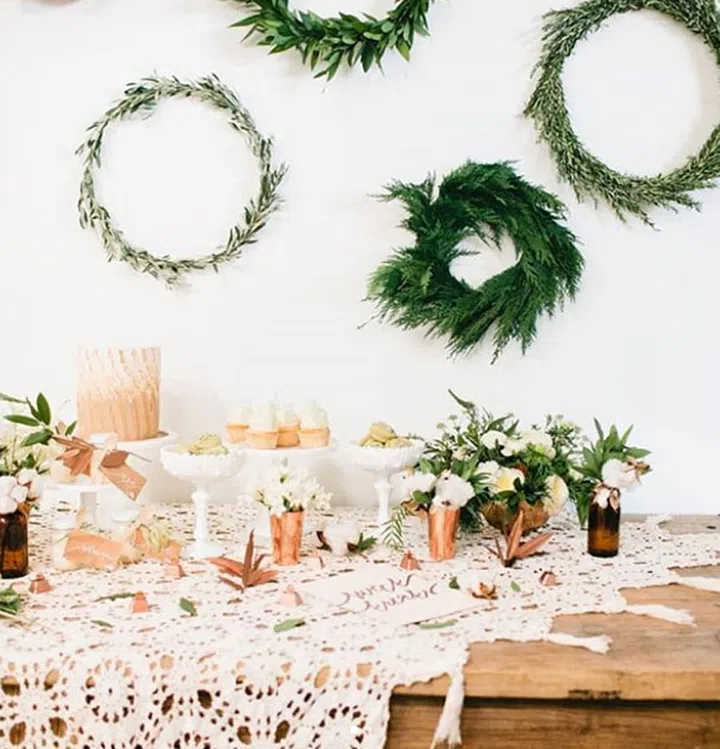 Instead of buntings or paper flowers, lush green wreaths are a great alternative that deliver a fresh woodsy charm. Go for a variety of shapes and sizes for an interesting visual display.
