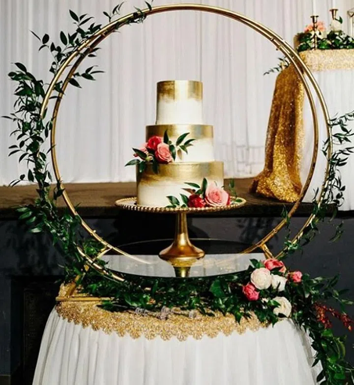 The wedding cake's a highlight of your wedding. Place it in the spotlight with an equally wow-worthy backdrop like this hooped structure entwined with foliage.