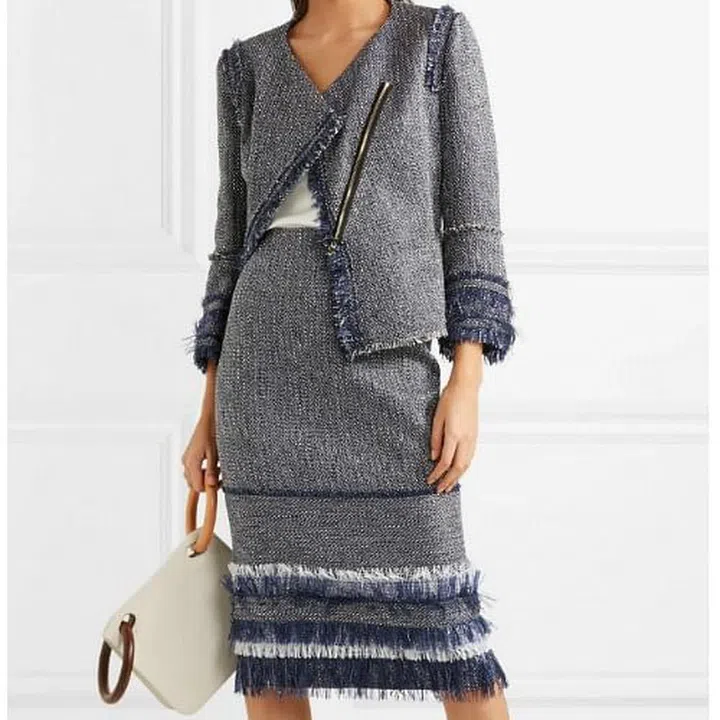 From the Roland Mouret’s resort ‘18 collection, this jacket and skirt uses texture, fabric and tailoring to create a feminine silhouette that is both stylish and professional.