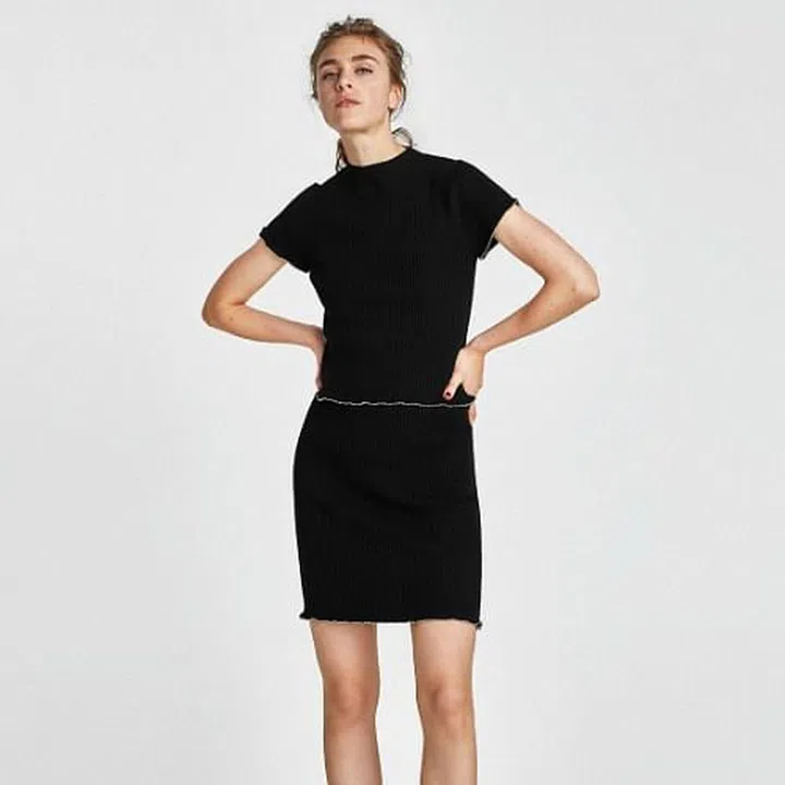 Ribbed sweater with metallic trim $49.90 and mini skirt, $49.90 from Zara.