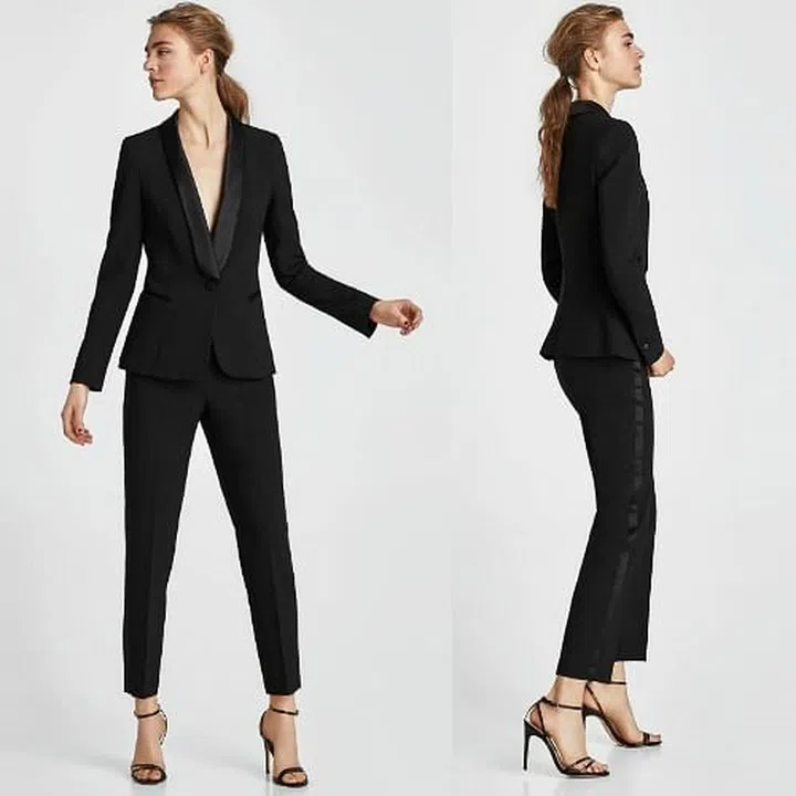 Tuxedo style blazer, $119.00 and tuxedo trousers with side trim details $69.90, from Zara.