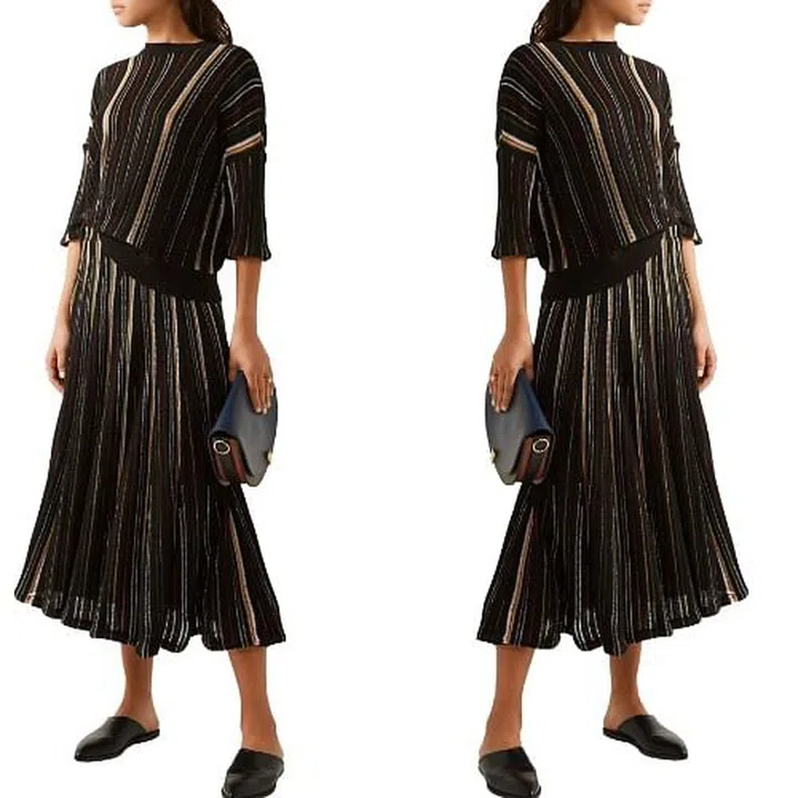 Adam Lippes striped open-knit cotton-blend sweater, US$294 and striped open-knit cotton-blend midi skirt, US$420 from The OUTNET.