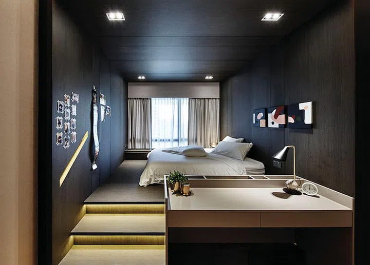 Taking advantage of the high ceiling (see these wow-worthy ceiling ideas) in the bedrooms, the designers created a cove in the daughter’s room. With dark wood-look laminate cladding the walls, floors and ceiling, the result is a cosy, restful space.
