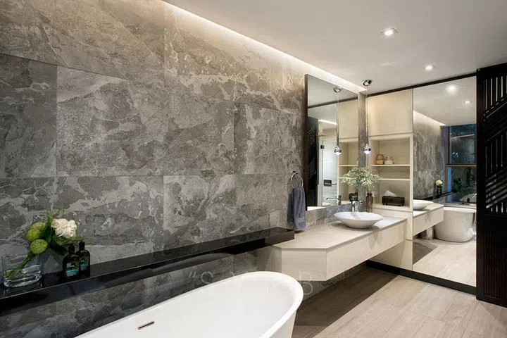 The bathroom takes a lighter colour palette, wuth marble-look tiles on the walls, and light wood-look tiles on the floor.