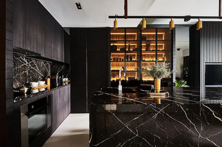 Vin Leong from Haelcyon Days, compartmentalised this 829sqf one-bedroom apartment in Bugis home into various “elements of surprise”; upon entering the home, guests will be greeted by a long and striking Nero Marquina marble countertop, before being drawn to the backlit cabinet housing travel mementos.