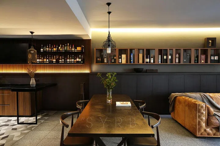 This cluster-house at Gerald Drive has charming interiors that exude a luxe, moody ambience. The interior design team at SYRB chose a darker colour palette, with black and grey as the primary colours in the living, kitchen and bar areas.