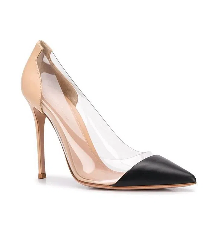 A clever use of transparent PVC panelling gives this Gianvito Rossi piece a d’Orsay silhouette. Its neutral-toned hue makes it versatile enough to match with both warm and cool-toned outfits of your choice, while the touch of black at the toe gives it a nice finish. We suggest wearing it with a white t-shirt and a corduroy pants combo.