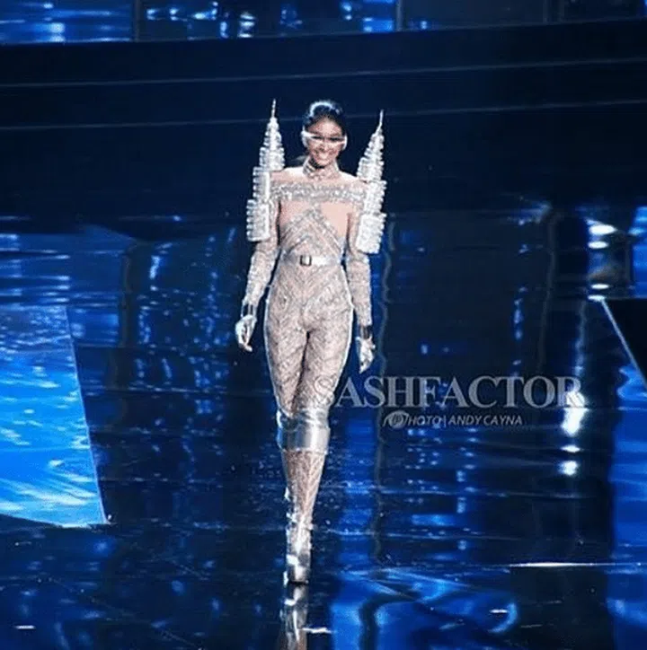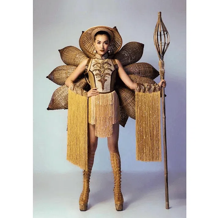 Miss Vietnam looked fabulous with her knee-high gladiator boots, shining tassels, as well as the lotus model attached to her back.