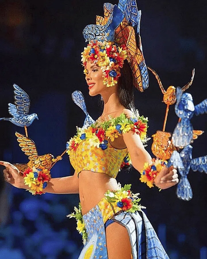 Here’s another bird-inspired outfit worn by Miss Dominican Republic. This bright and cheery costume is completed with floral embellishments.