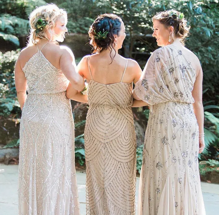 Sparkly frocks for a glam wedding theme! Silvery embroidery on light almond dresses look both romantic and sophisticated.