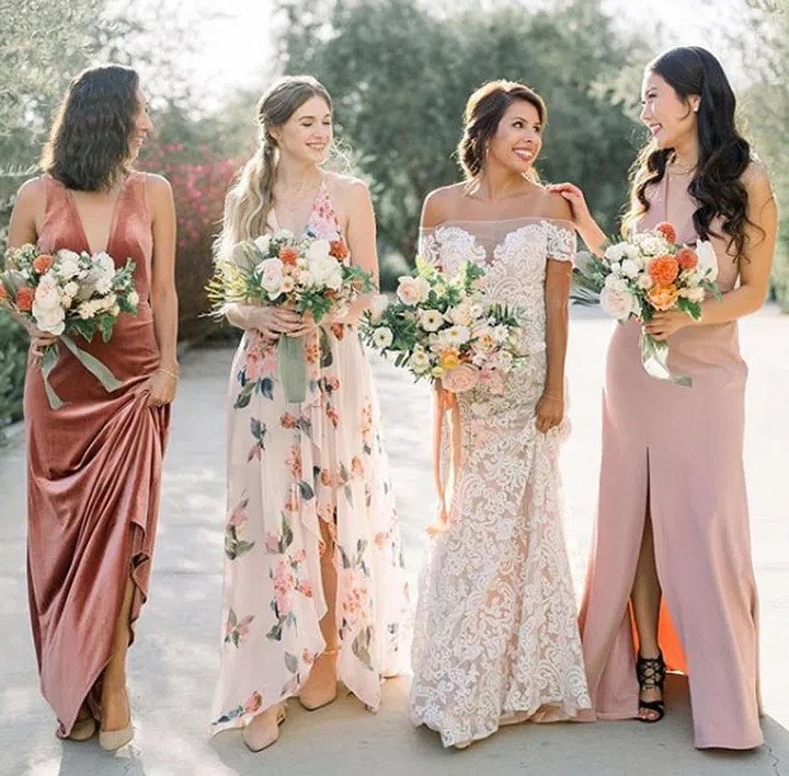 Instead of having everyone wear the same dress, think different textures, patterns and lengths but in a similar colour palette so it still looks cohesive.