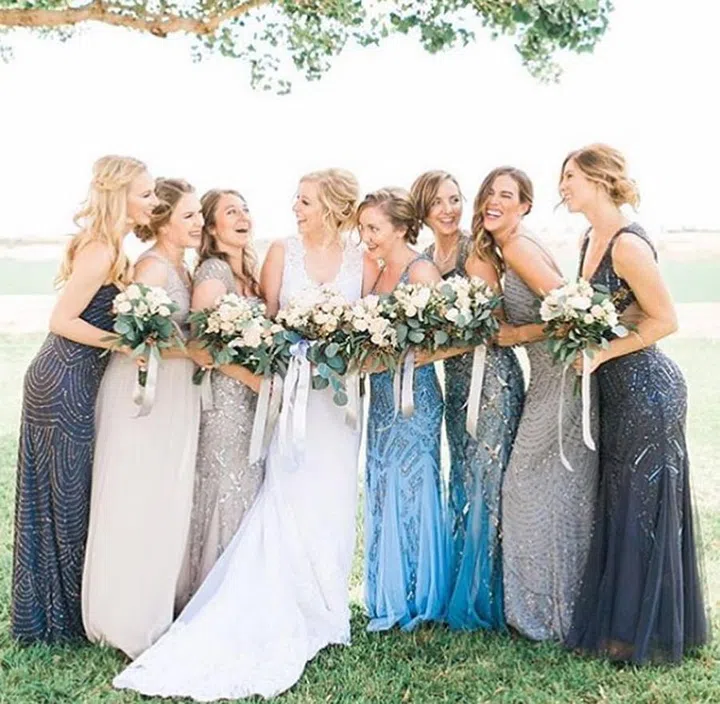 For your something blue: Your bridal party in gorgeous shades of blue. Shimmery details bring more sparkle to your wedding day!