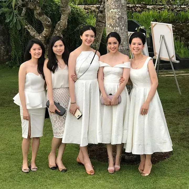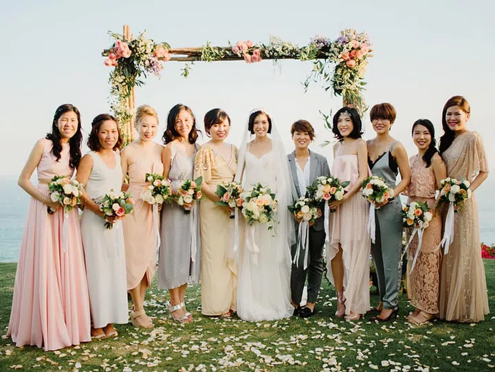 Real bride Olivia had her bridal party in dreamy pastels for her resort wedding in Bali. While the bridesmaids donned outfits of their choice with different details and styles, similar and matching colours kept the look pulled together.