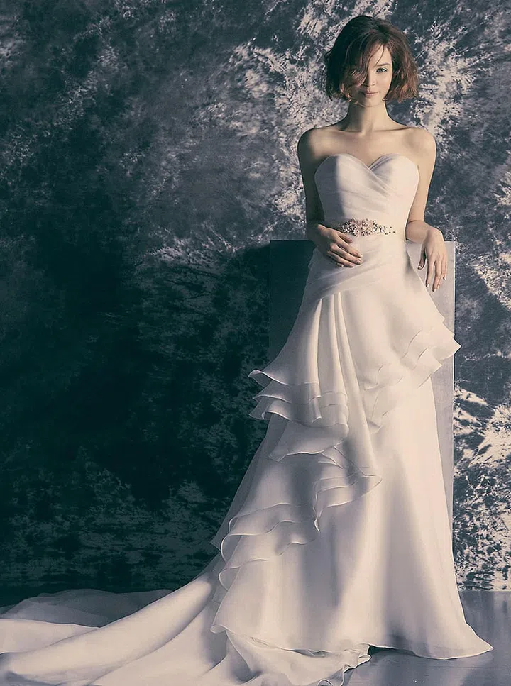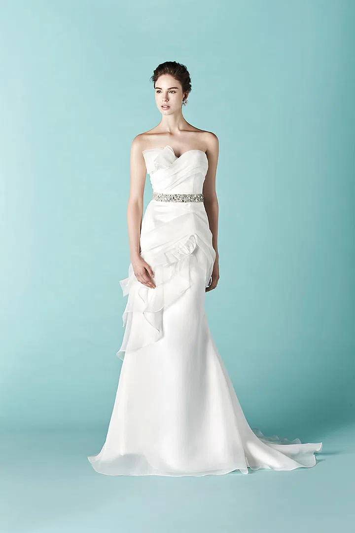 This duchesse satin and organza A-line gown shows how cascading ruffles is an art in itself.