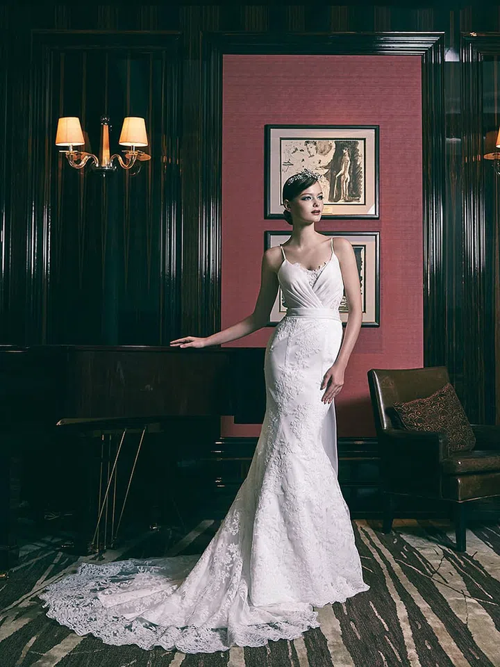 Old-world romance interweaves with new-world aesthetics in this dress. Its chic structured camisole top is accompanied with brocade lace detailing and a lace embellished chapel train.