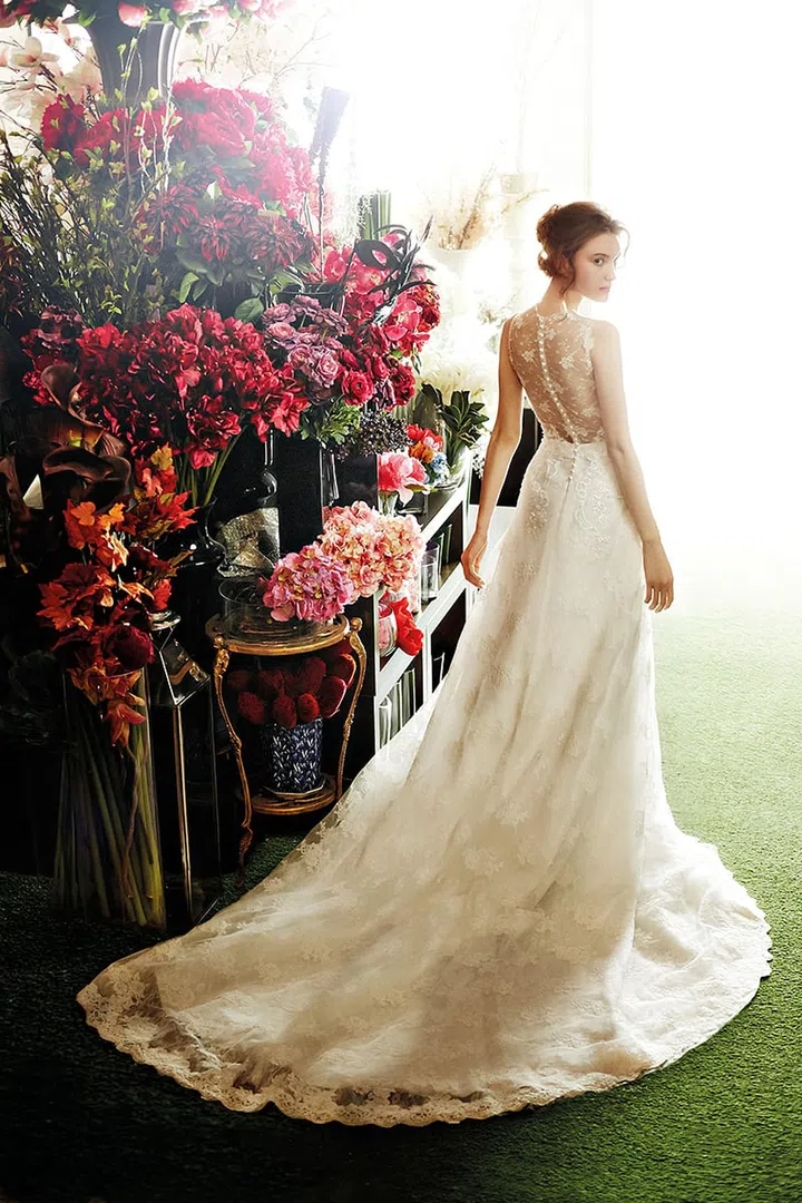 With pearls adorning its sheer lace back and an opulent lace cathedral train, this dress will definitely leave your guests enthralled.