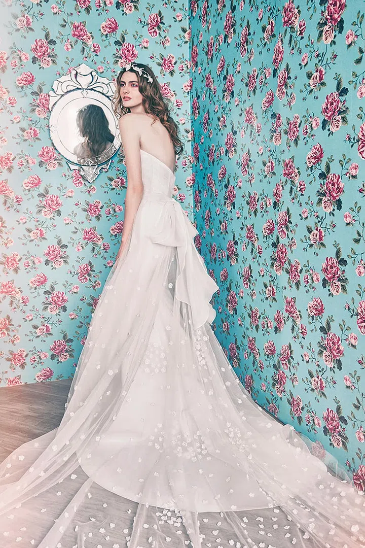 With its silk flower-embellished tulle skirt and chapel train, this gown encapsulates the romance found in gorgeous and subtle detailing. The walk down the aisle will definitely be made that much more beguiling.