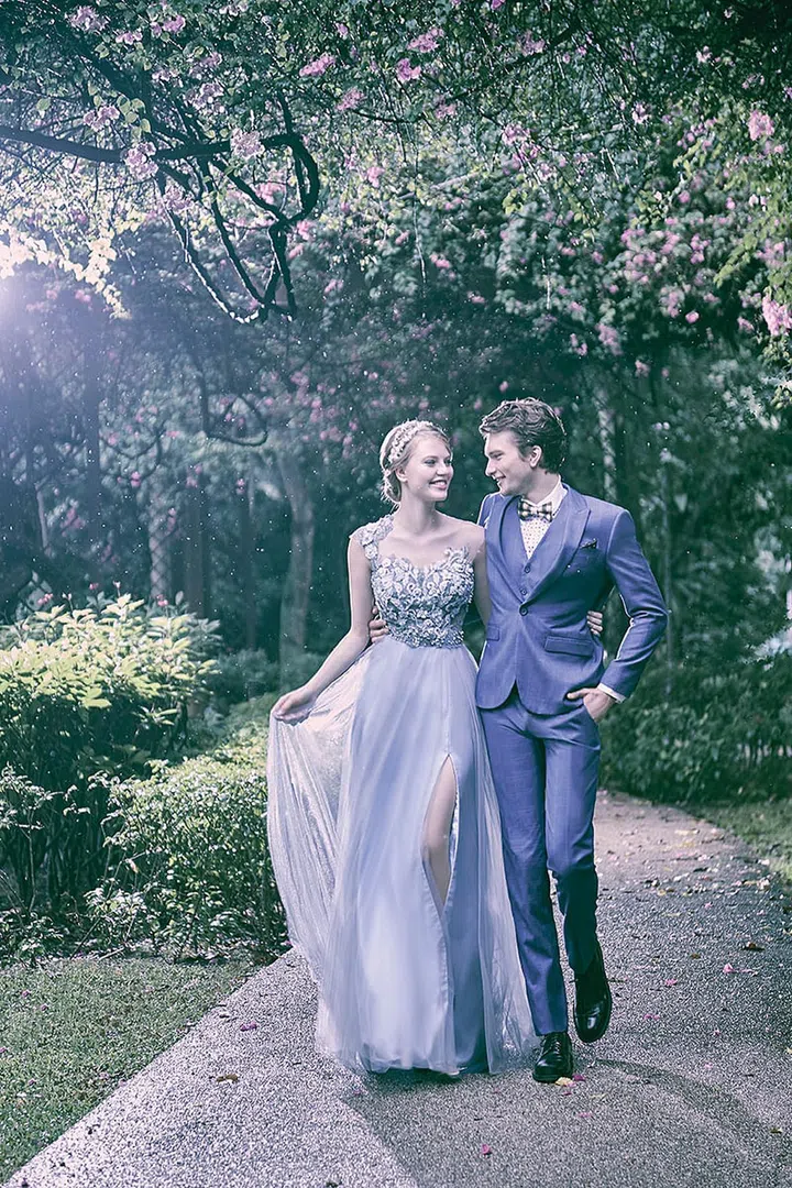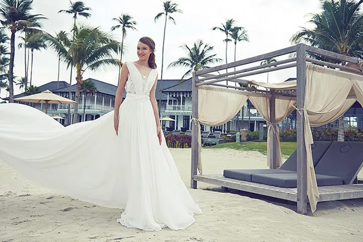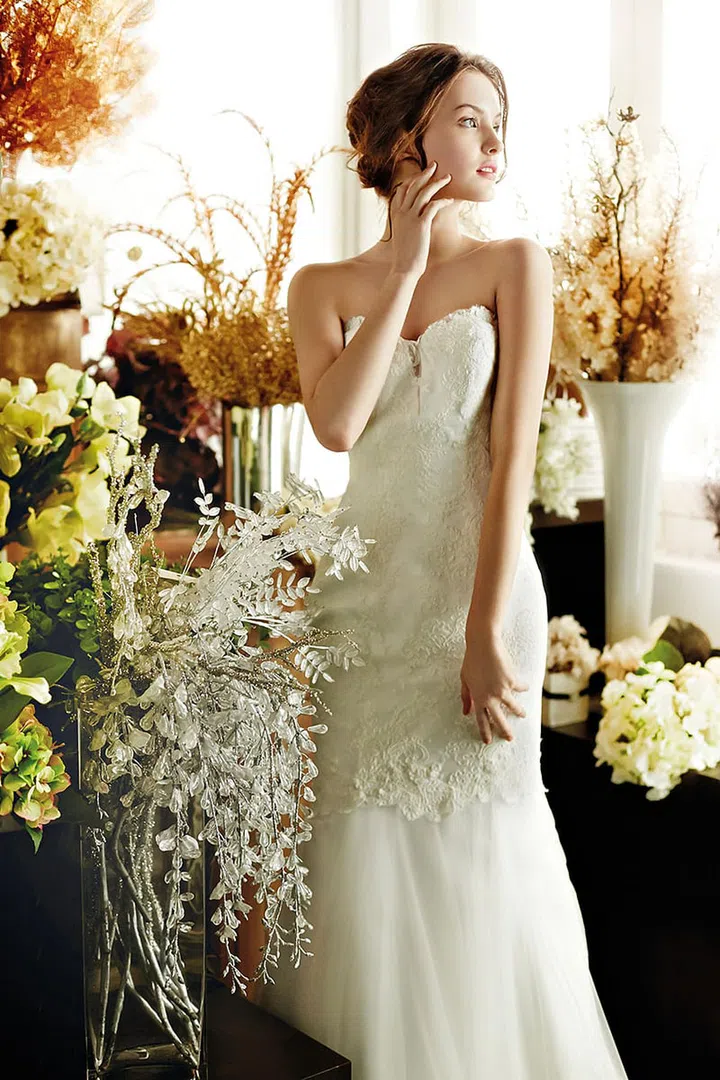 If you're not one for over-the-top gowns, then this is the gown for you with sheer chiffon seamlessly blending in with its appliqued form-fitting lace bodice that flows out with a sweep train. Play it up with accessories and a richly coloured bouquet.