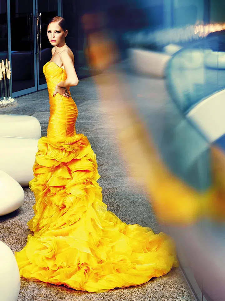 Glam up your night with this glimmering golden yellow gown that is decadence through and through with it's form-flattering body and lush layers of silk organza ruffles. All eyes will be on you.