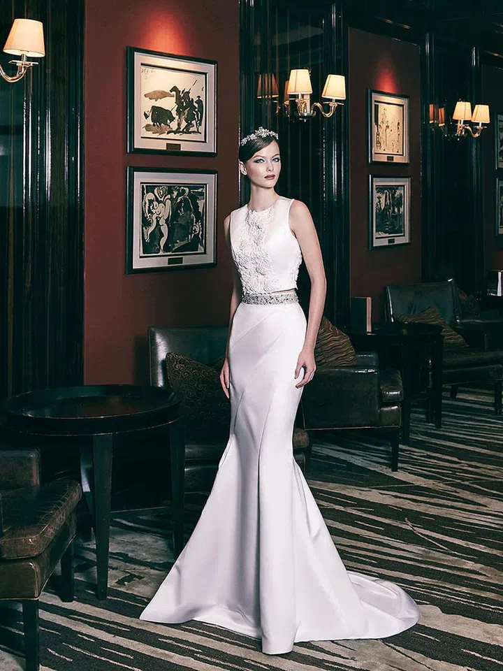 Traditional detailings finds harmony with this modern figure-skimming 2-piece beaut.
