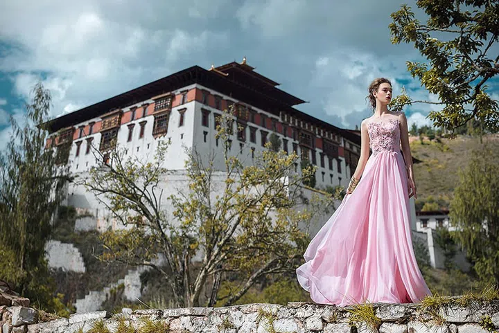 Bring the dreaminess to your big day with this exquisite pink gown that's gently set off with a soft-flowing chiffon skirt.
