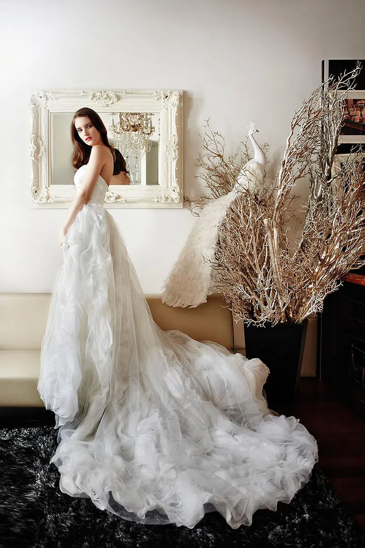 Be captivated by the dramatic ethereal swathes of tulle that trails off the gown, leaving an otherworldly impression you won't be able to shake off.