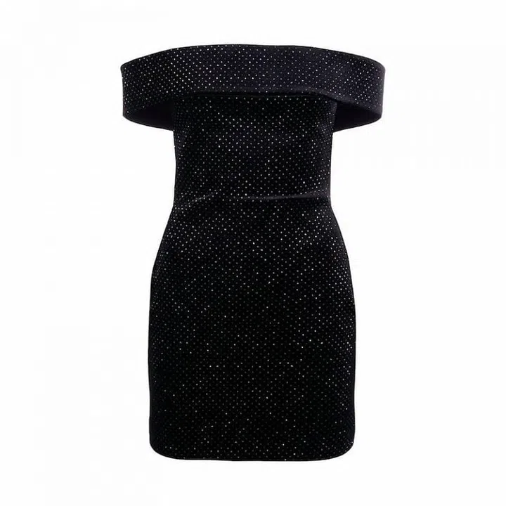 This mini dress is made from black velvet with glitter. The off-shoulder neckline makes this the perfect dress for a romantic evening date.