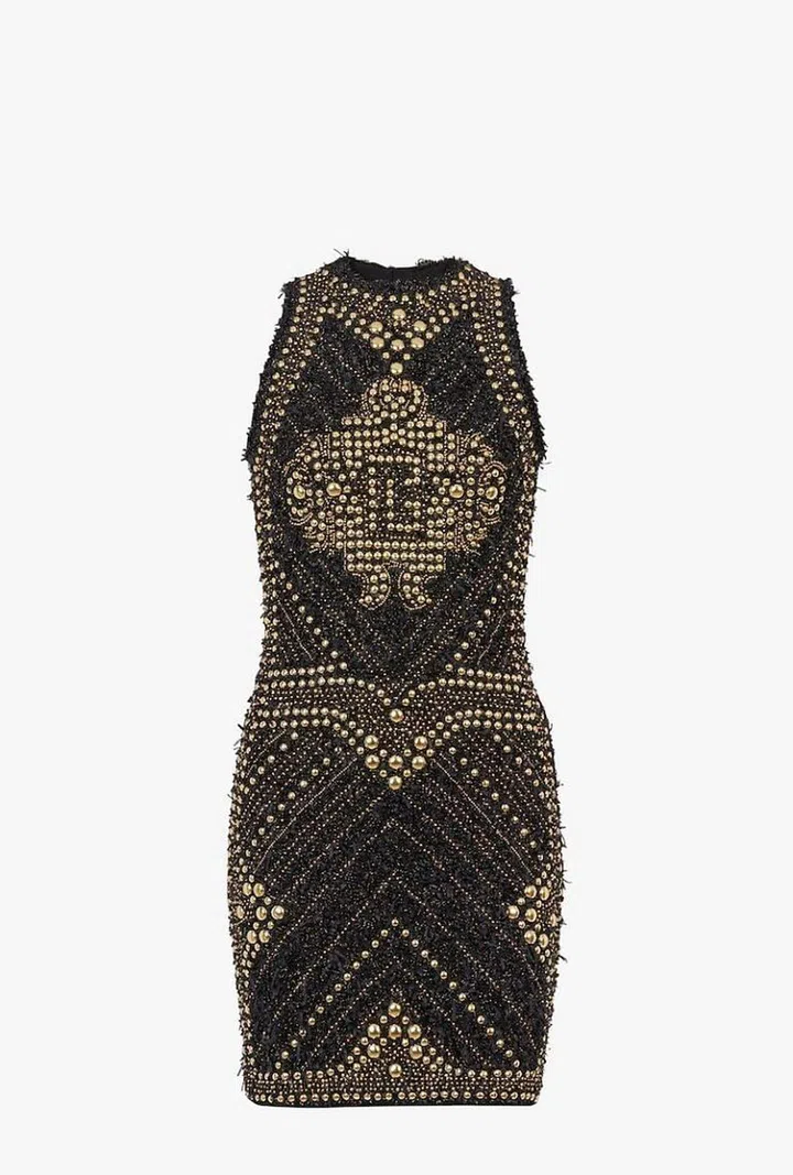 Balmain nailed it with this fitted studded dress. The all-over gold-tone stud detailing works beautifully here. With a dress this embellished, you don’t really need to do much. A simple pair of earrings and pointy-toed black shoes are all you’ll need to steal the limelight.