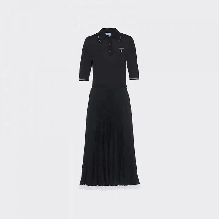 This Prada dress has a sophisticated silhouette with a seamed waist and pleated skirt that creates a delicate, fluid movement. This ultra chic dress also features a new jacquard knit triangle logo that adds a conceptual note. Work this dress with sandals, Mary Janes or your whitest pair of sneakers.