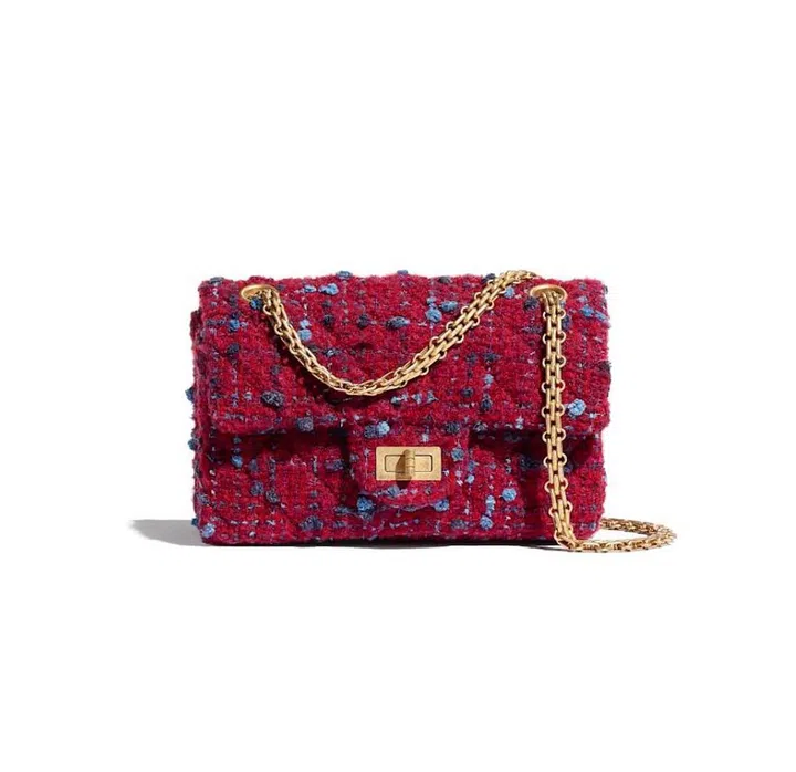During Fall Winter 2020 season, the brand’s artistic director Virginia Veard ingeniously incorporated the coarse tweed fabric from the Ready-To-Wear collection into the 2.55 handbag design.
