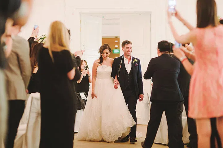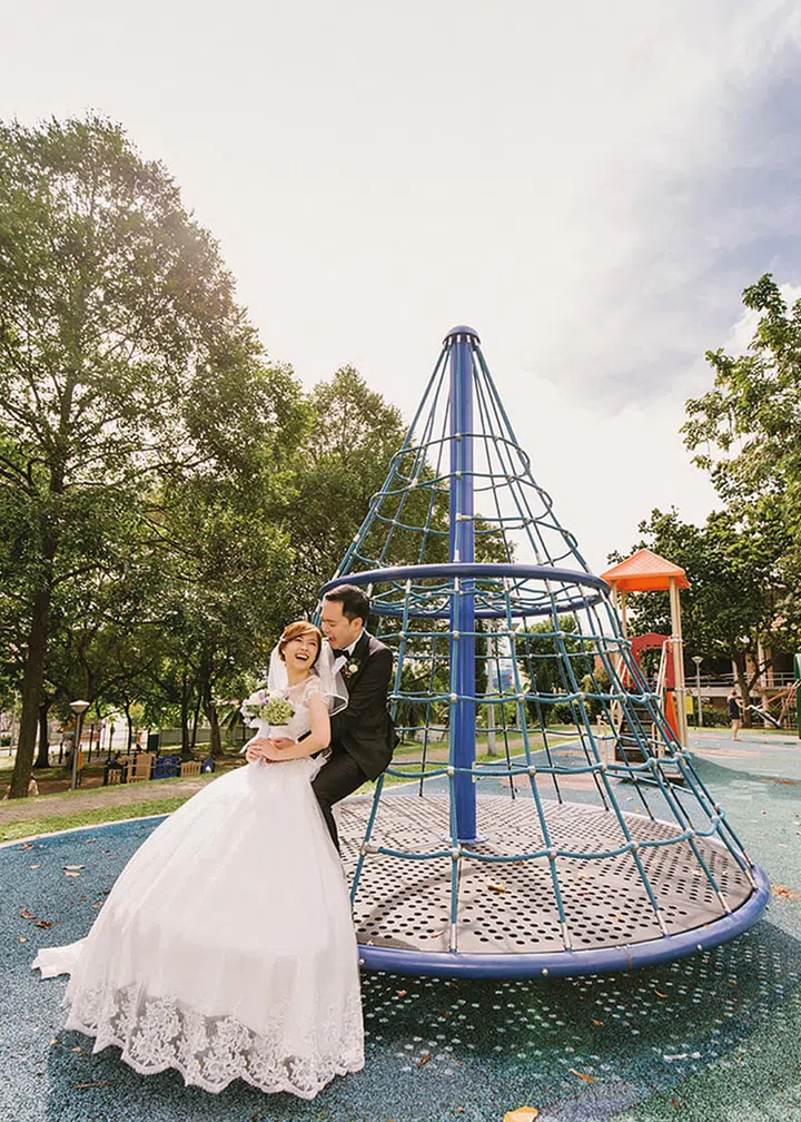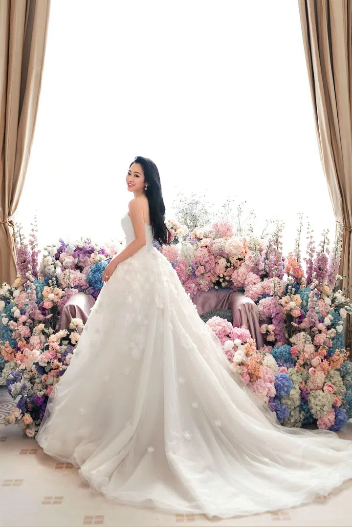 Celia Chen's classic and timeless princess ballgown from a Hong Kong bridal salon matched the cosy and elegant ambience of her nuptials to her French beau at The Straits Room.