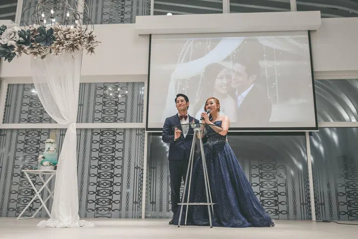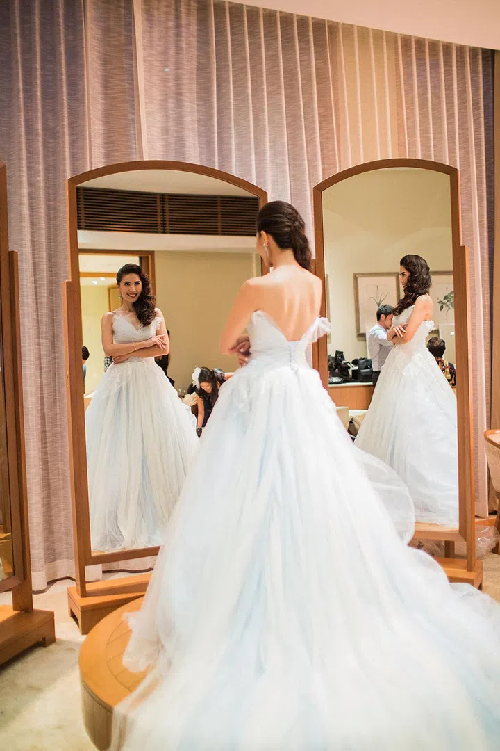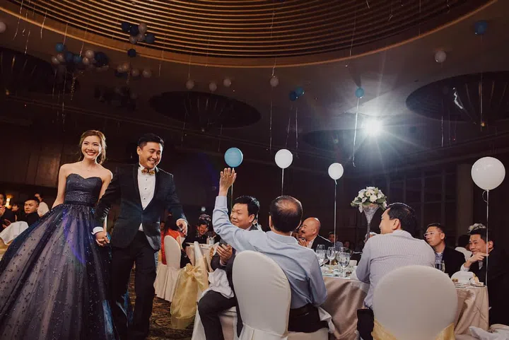 For her sky-themed wedding at The Ritz-Carlton Millenia Singapore, real bride Gillian Siow fell in love with this starry dark blue ballgown number with a sweetheart neckline as her evening gown choice!