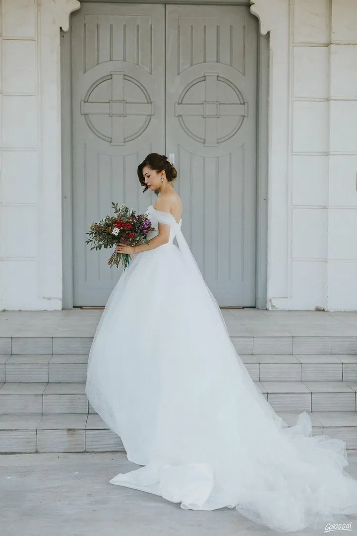 Andie Chua's white, off-the-shoulder ballgown for her church wedding was a treasured find from Taobao! This soft, dreamy design was accentuated by jewel-toned blooms and a gorgeous updo with emerald jewellery. She also wore it for her first march-in during her banquet at Capella Singapore.