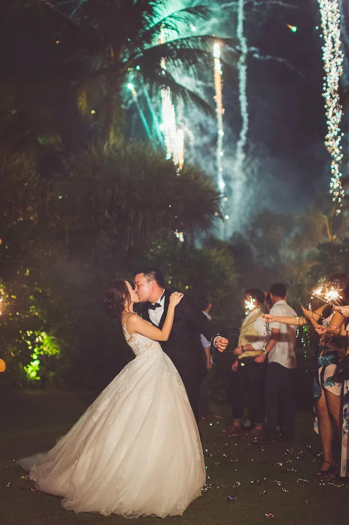 Air stewardess Shannon Low chose her gorgeous ballgown from Pronovias St. Patrick's 2018 collection as she loved how it was simple yet elegant. It certainly didn't lose out to the stunning backdrop of fireworks that accompanied her beach side wedding dinner at Shangri-La's Rasa Sentosa Resort & Spa!
